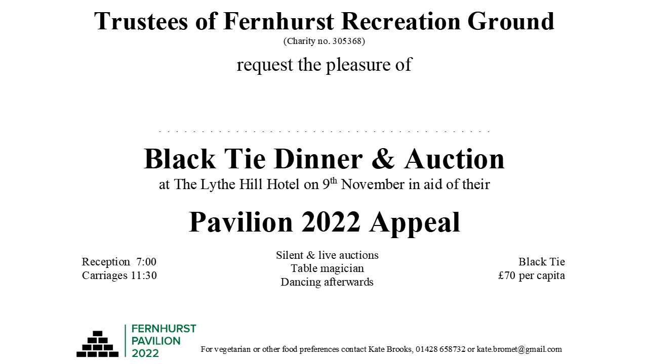 On 9th November at The Lythe Hill Hotel a Black Tie Dinner and Auction shall take place in support of Pavilion2022. Find out more. Tickets are available from kate.bromet@gmail.com.